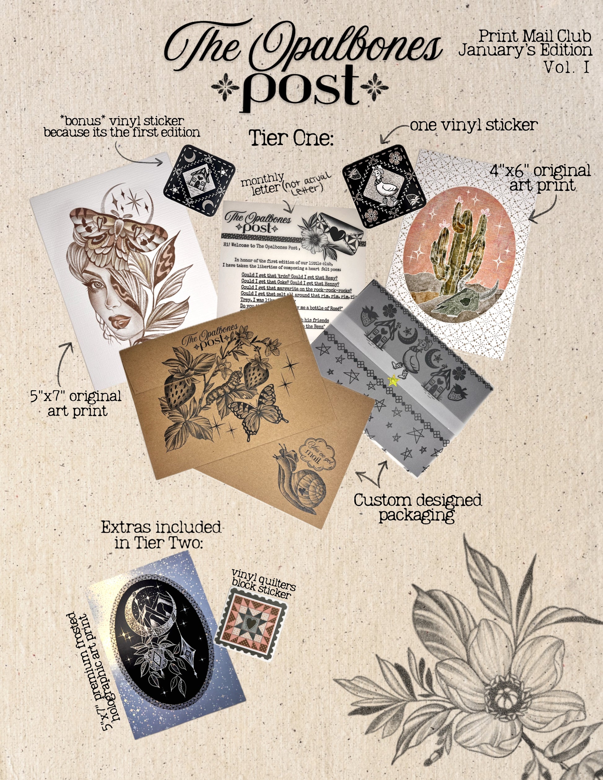 Tier one: 5x7 Moth Lady print, 4x6 Moonlight Cactus, Vinyl howdy goose sticker, Home is with you sticker, monthly letter, custom vellum, custom envelope.