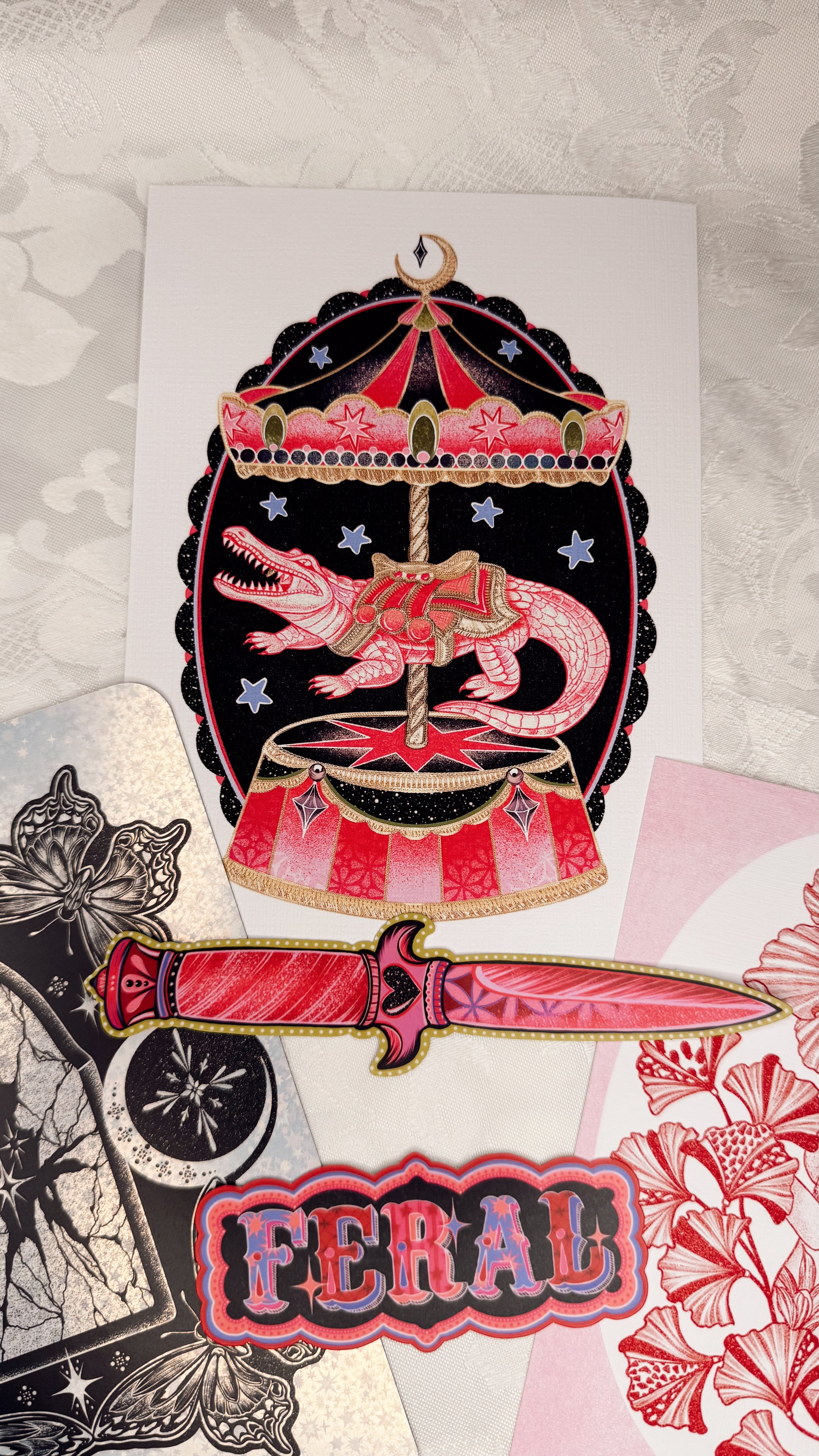One of the following: 4"x6" print, mini foil print, bookmark, additional sticker, mini print, postcard.