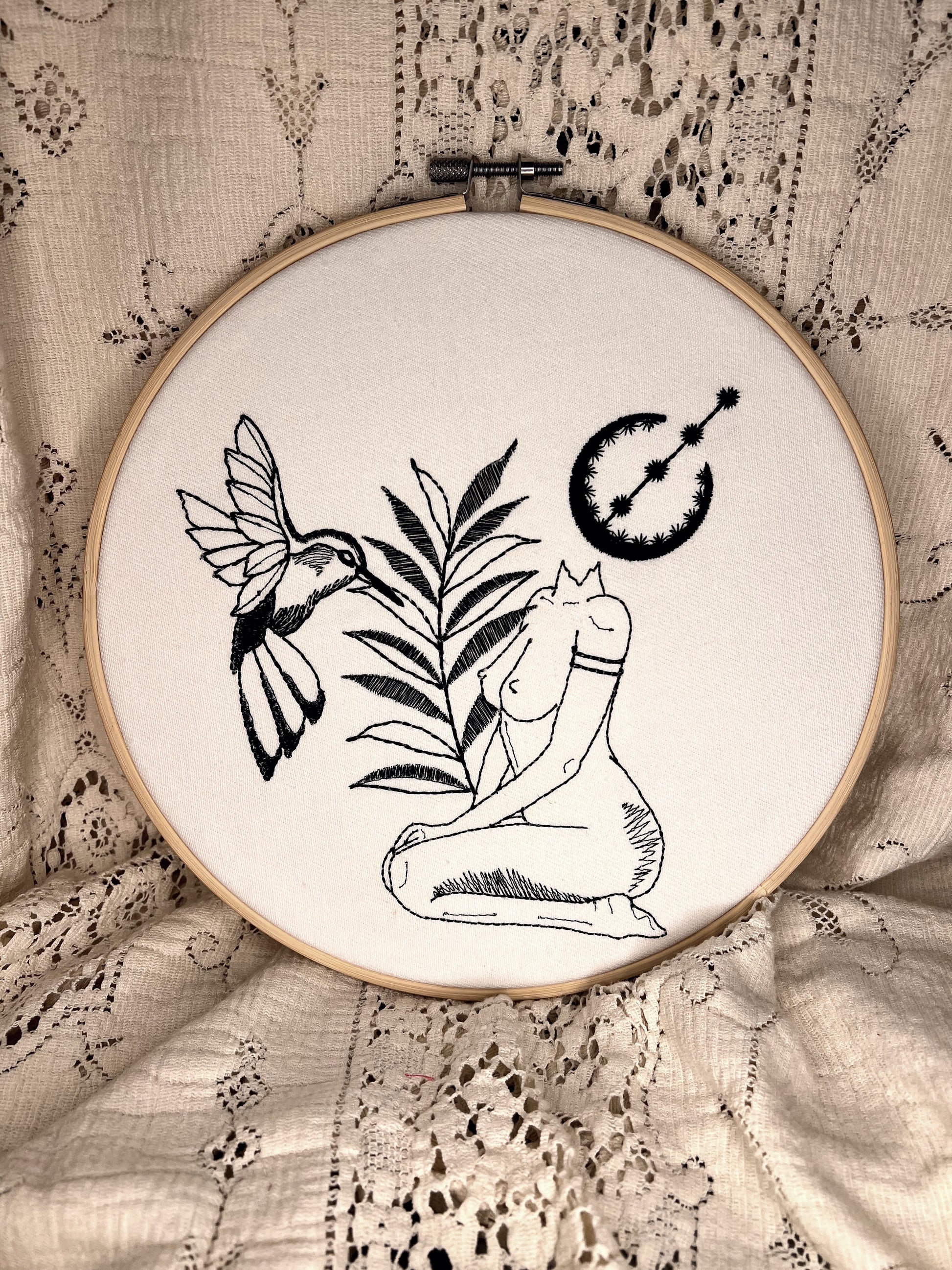 Embroidered original design, framed in a round wooden hoop. 9” Hoop