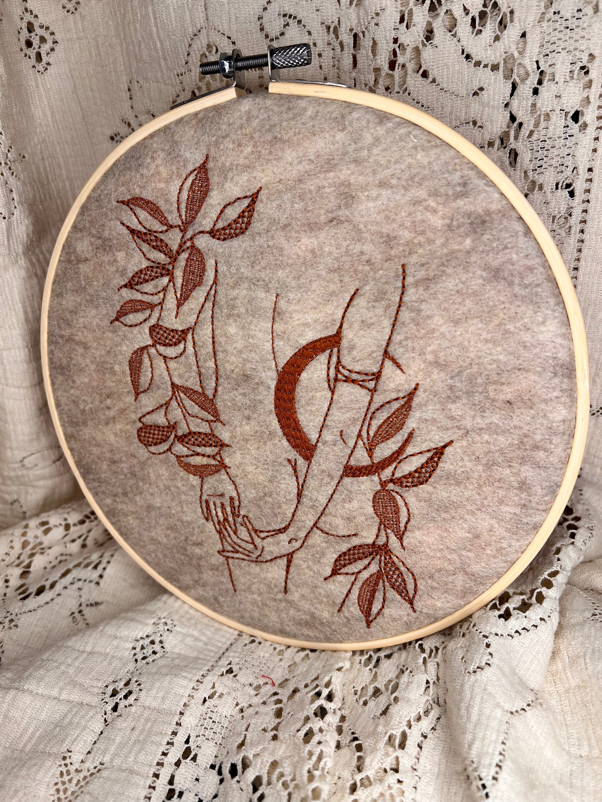 Embroidered original design, framed in a round wooden hoop. 8” Hoop Burnt Sienna thread on tan/beige thick felt